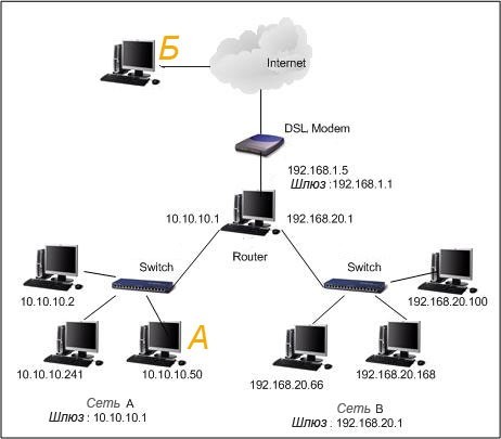 Компьютеры А и Б обмениваются информацией. Какой IP адрес виден на компьютере Б?