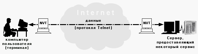 Когда устанавливается соединение, предполагается, что оно начинается и завершается на "Сетевом Виртуальном Терминале" (Network Virtual Terminal, NVT). NVT -- это воображаемое устройство, которое создает промежуточное стандартное представление канонического терминала. NVT является стандартным описанием наиболее широко используемых возможностей реальных физических терминальных устройств. NVT позволяет описать и преобразовать в стандартную форму способы отображения и ввода информации.